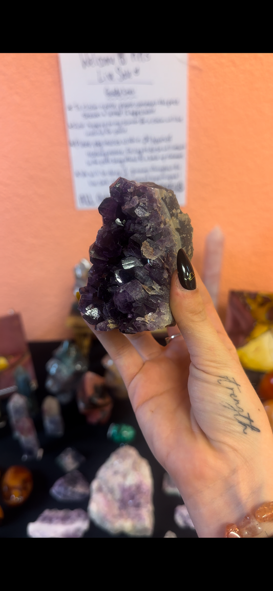 Crystals: Amethyst, Lepidolite, Fluorite, Selenite, Moonstone.